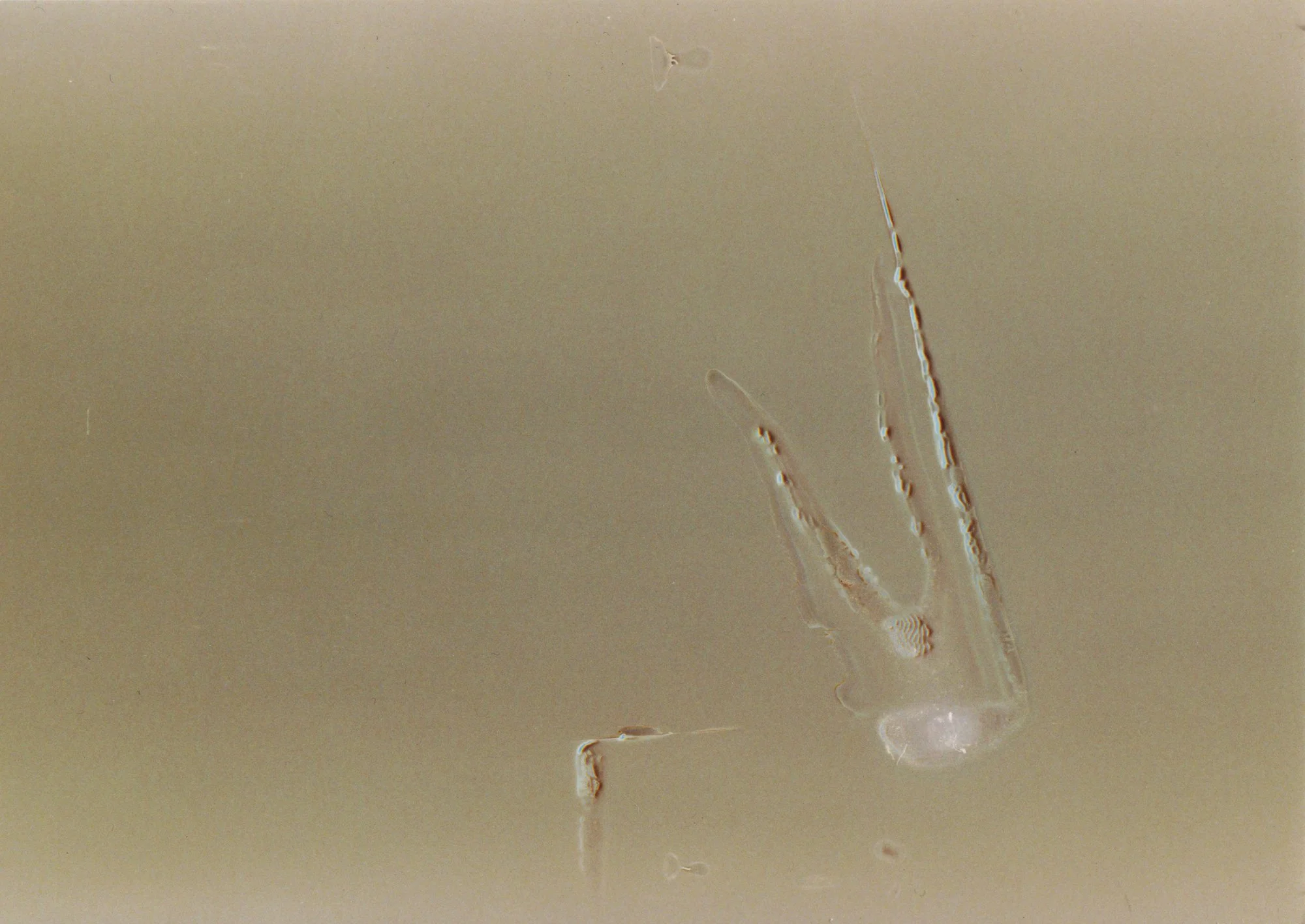 This series of images came about when I picked up a roll of film at the lab and several of the images came out cloudy pink and grey with fossil like elements. They had thrown the prints away but kept the scans. I corrected the color temperature, curves and contrast. The resulting work is reminiscent of the beach, sand, fossils and marks from another era.